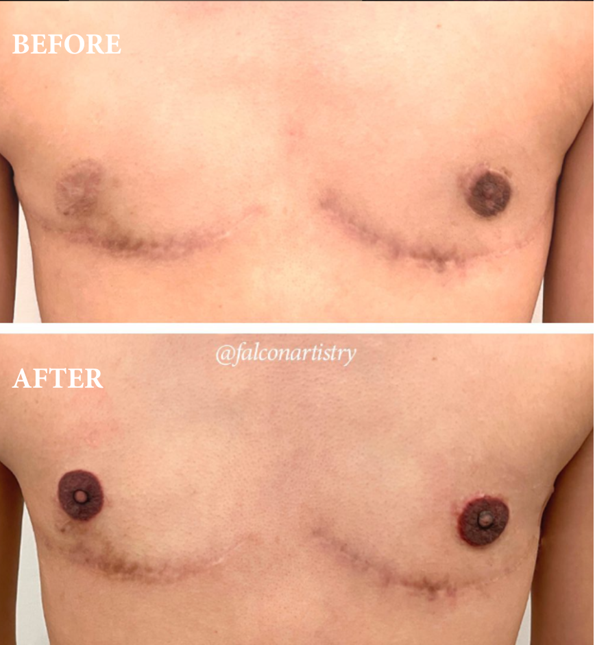 Nipple tattoos, scars, bottom surgery pigmentation & custom work.