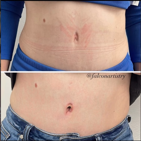 Soften the appearance of stretchmarks with custom camouflage tattoos that blend with your natural skin tone.