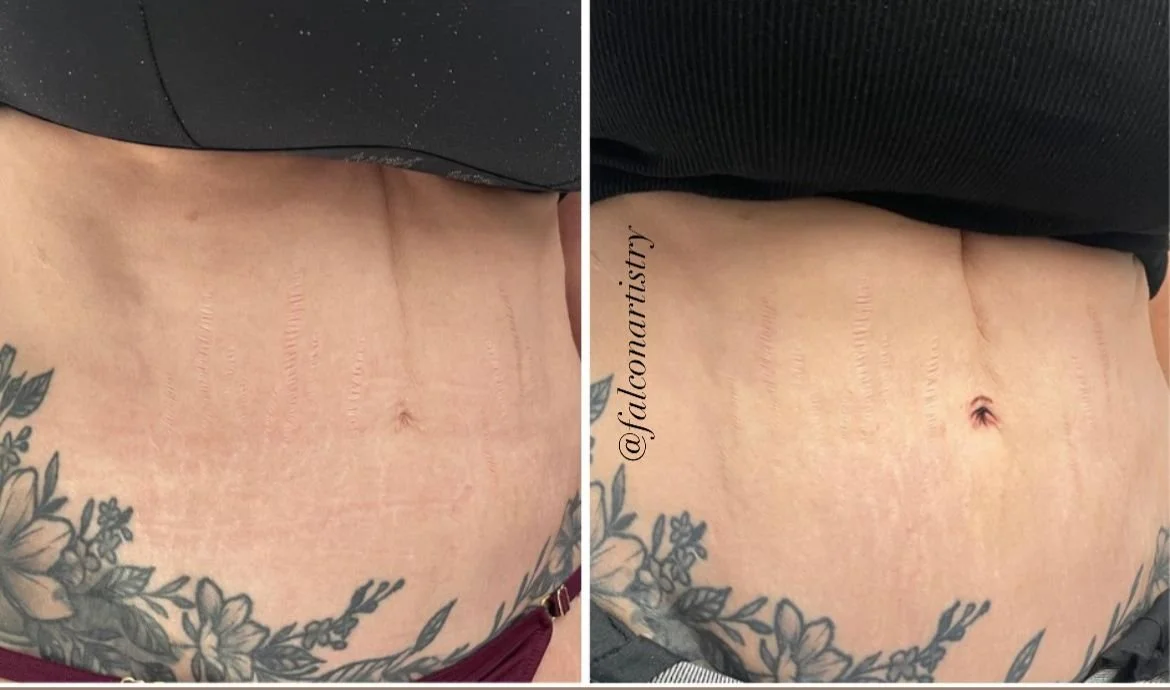A tattooed bellybutton recreates the appearance of a navel that was lost or significantly altered through surgery (such as a tummy tuck or abdominal reconstruction). The tattoo uses shading and colour gradients to create the illusion of depth and a natural-looking bellybutton. This is a common request from clients who are unhappy with the appearance of their navel after abdominal surgery.