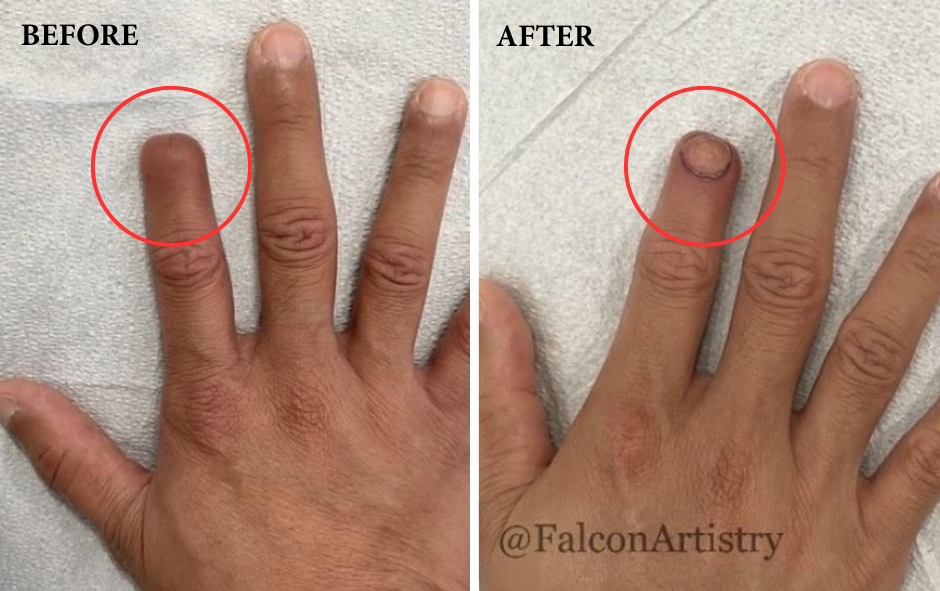 Examples include missing fingernails, lost bellybuttons after surgery, webbed toe separation (syndactyly), skin graft pigmentation, vitiligo camouflage, birthmark blending, and any unique anatomical concern where a tattoo can restore natural appearance.
