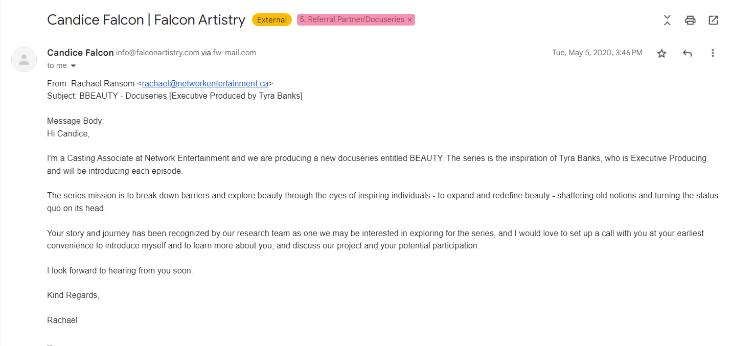 In May 2020, Candice was approached to be on a docuseries about unique beauty and things people do for it. (She signed an NDA for this after this initial email and the docuseries didn’t go through as the film crew couldn’t come to Canada and film during COVID and the shutdown lasted too long.)
